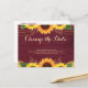 Ce design rustique de campagne présente des guirlandes lumineuses dorées et de la dentelle ainsi que des tournesols et des brins de fleurs marsala bordeaux sur un fond en bois de grange rouge vin marron. Le texte personnalisable apparaît en or pâle sur le devant dans une typographie populaire script et serif. Le texte au dos est bordeaux pour correspondre au bois sur le devant. Vous pouvez personnaliser cette carte postale de date en changeant le texte dans le modèle pour votre propre mariage.