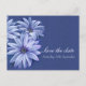 Magnifique peinture osteopermum calenduleae mariage enregistrer la date invitation. Mariage simple et romantique sauvez l'invitation de date, dans les tons bleu violet et blanc à lilas. Mariage classique partie design de la marguerite romantique mariage fixe. Modifiez cette page et enregistrez la carte postale mariage date avec vos noms, dates et votre propre libellé. Uniquement peint en gouache sur papier sombre par l'artiste et designer Sarah Trett.