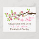 Carte postale de mariage printanier avec fleurs de cerisier roses Enregistrez la date comportant une branche brune d'un cerisier avec de magnifiques fleurs de sakura roses et des feuilles vertes. Cette conception de modèle de mariage floral moderne, élégant et stylé est entièrement personnalisable et fait partie d'un ensemble de mariage parfait pour votre mariage de jardin printanier ou estival.
