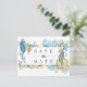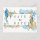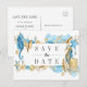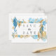Carte postale de mariage d'été bleu et or, Enregistrez la date avec des hippocampes, des étoiles de mer, des coquillages et des récifs coralliens. Pour une personnalisation avancée de ce design, veuillez cliquer sur le bouton "Personnaliser" ci-dessus ! Des articles assortis sont également disponibles.
