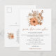 Lorsque vous devez reprogrammer votre mariage, cette carte postale pratique permet à vos invités de sauvegarder votre nouvelle date. Same Love New Plan est écrit dans un style manuscrit moderne de couleur brun clair et le reste du texte au recto et au verso peut être facilement personnalisé. Un bouquet de fleurs et de feuillage aux couleurs automnales est situé en haut et un motif floral coordonné est également au verso avec votre site web de mariage et les détails de votre adresse de retour.