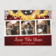 Carte postale personnalisée de mariage tournesol et rouge avec un collage de photos sur un fond en bois rustique avec des tournesols, dentelle florale et guirlandes lumineuses.