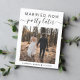 Faire-part de mariage ou carte postale d'annonce de mariage intime ou de fuite moderne pour informer la famille et les amis que vos plans de mariage ont changé, vous obligeant à vous enfuir ou à réduire le nombre d'invités à votre mariage à un petit groupe intime, mais que vous organiserez une fête de célébration à l'avenir. Le recto présente votre photo et "Mariés maintenant, fête plus tard" dans un mélange de typographie simple et de script tendance. Sous votre photo, vous pouvez ajouter vos prénoms et la date de votre mariage. Au verso, vous pouvez personnaliser votre message de manière plus détaillée et vos noms dans un script ressemblant à une signature.