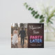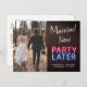 Faire-part de mariage moderne et élégant pour annoncer un mariage intime ou une fuite en amoureux à votre famille et vos amis, leur indiquant que vos plans de mariage ont changé, vous obligeant à vous enfuir ou à réduire le nombre d'invités à votre mariage, mais que vous organiserez une fête de célébration à l'avenir. Le recto présente votre photo d'un côté et "Mariés maintenant" dans un script blanc et "Fête plus tard" en typographie rouge et bleue avec un effet de néon lumineux sur fond de mur de briques. Au verso, vous pouvez personnaliser votre message de manière plus détaillée et vos noms dans un script ressemblant à une signature.