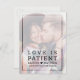 Annoncez votre report mariage à votre famille et à vos amis en style avec cette photo personnalisée moderne enregistrer la carte postale date. Ce modèle design chic présente votre photo défraîchie à l'avant avec une superposition opaque et un cadre découpé. Les mots lisent "L'amour est patient" avec votre nouvelle date de mariage et vos noms à personnaliser. Le dos de la carte postale contient plus de détails mariages pour customiser sur un arrière - plan gris colombe. Félicitations pour votre fiançailles et voeux de mariage ! Conçu par l'artiste ©Susan Coffey.