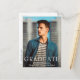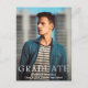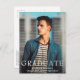 Carte postale moderne pour l'obtention d'un diplôme de jeune garçon avec un design simple et masculin avec "Graduate" en gros caractères gras, avec le nom du diplômé, l'année et le nom de l'école sur votre photo verticale de fond de sang préféré. L'arrière a votre message personnel / invitation de fête et adresse de retour en bleu marine sur un arrière - plan blanc.