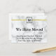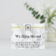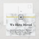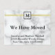 'Nous avons déménagé' apparaît en gras noir au centre de cette annonce au look de marbre blanc. Dans un petit carré en haut de l'autocollant, vous pouvez personnaliser vos cartes de changement d'adresse avec votre monogramme. En bas, vous pouvez indiquer votre changement d'adresse avec votre nom et votre nouvelle adresse.