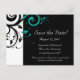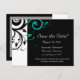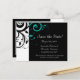 Faire-part de mariage noir contemporain moderne et audacieux avec des accents de sarcelle aqua turquoise et des détails blancs, avec un fond festif en forme de feuille en volute. Personnalisez en ligne avec vos informations de mariage.