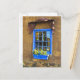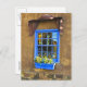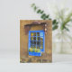 Personnalisez cette carte postale. Une fenêtre de style français bleu cobalt vif sur un mur en adobe et en pierre. Santa Fe, Nouveau-Mexique. Photographie de Minerva Bloom.