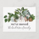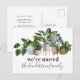 Cartes postales d'annonce de déménagement modernes avec feuillage botanique aquarelle, plantes d'intérieur et vos nouvelles coordonnées au verso.