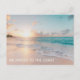 Belles cartes de changement d'adresse de maison de plage qui disent Nous avons déménagé sur la côte. Partagez votre nouvelle adresse de maison au bord de la mer avec vos amis et votre famille en utilisant cette jolie carte postale photographique de l'océan. Un rivage au lever du soleil.