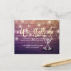 Modèles de cartes postales photo pour annonce de report de mariage moderne - lettrage élégant, verres à champagne vintage et guirlande lumineuse sur fond en bois rustique coloré.