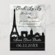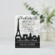 Cette belle invitation à la carte postale Save the Date vous permet d'ajouter votre propre photo derrière la ligne d'horizon parisienne complète avec la tour Eiffel. Les couleurs noir et blanc sont sophistiquées.