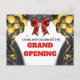 Une merveilleuse illustration d'un ruban rouge brillant factice bordé d'or avec incrustation de diamants reposant contre un rideau de théâtre noir rempli de serpentins dorés factices pendants; des ballons noirs et dorés et des paillettes rouges et or factices sur fond blanc avec des modèles blancs et rouges pour votre texte personnalisé. Le dos a un fond noir et les mêmes paillettes factices sur lesquelles apparaissent des modèles blancs pour des détails supplémentaires pour les nouveaux clients et invités qui peuvent être supprimés si non requis. Ceux-ci sont idéaux pour toute entreprise ayant un lancement en douceur ou pour les entreprises qui souhaitent faire savoir aux acheteurs potentiels de "réserver la date" pour leur grande ouverture. Ces cartes plates luxueuses et élégantes raviront vos invités.