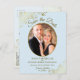 Cette belle carte postale de date est conçue pour donner à vos amis et à votre famille un préavis de votre prochain mariage. Il présente un design simple mais élégant avec du texte doré sur un arrière - plan bleu poudre pâle, et votre photo dans un cadre ovale entouré de frilly boucles et tourbillons de fausse feuille or. Le dos a un joli graphisme "crayon nous dedans" et l'espace pour une note personnalisée.