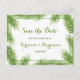 Ces cartes postales de date sont parfaites pour tout couple qui planifie une célébration de mariage romantique sur la plage de destination. Le design présente des feuilles de palmiers tropicaux verts branchés sur un arrière - plan blanc épuré simple avec une bordure et un libellé coordonnés. Le design simple peut être personnalisé pour convenir à votre événement spécial et sera le faire-part parfait pour n'importe quelle fête sur la plage, y compris : douches nuptiales, fiançailles, wedding showers, fêtes d'anniversaire et bien plus encore.