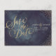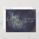 Glamor lettrage à main en or design de calligraphie et points d'or confetti sur bleu marine sombre nuit aquarelle arrière - plan, effet de parties scintillant d'or faux métallique, moderne, chic, élégant et classe, parfait pour mariage vintage ou mariage d'hiver en soirée. Personnalisez votre propre enregistrer la carte postale de date pour votre jeu de faire-part de mariage. Voir toutes les pièces correspondantes dans cette collection de calligraphie de parties scintillant dorée Glam night ci-dessous.