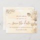 Un arrière - plan doré à l'eau décoré de feuillage d'eucalyptus doré et de poussière de parties scintillant en faux or. Personnalisez et ajoutez la date, le lieu et vos noms. Lettres de couleur dorée. Le texte : Save the Date est écrit avec un grand script de style à la main tendance. Retour : arrière - plan doré, design de carte postale. Conseil : Si vous ne voulez pas qu'il ressemble à une carte postale, cliquez sur customiser, allez à l'arrière et retirez le séparateur et le timbre postal.