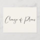 Si les circonstances vous obligent à réduire la taille et le nombre de participants à votre mariage, vous pouvez informer votre liste d'invités élargie avec cette carte de notification de changement de plans de mariage plus petite, moderne et minimaliste, mais élégante et chic, de couleur crème clair. "Changement de plans" est écrit dans un style script sur le devant et vous pouvez personnaliser le message de réduction de mariage avec plus de détails et ajouter toute information de diffusion en direct de la cérémonie, de célébrations futures et de site web de mariage au dos.