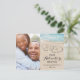 Cartes postales de plage pour annoncer votre date avec une photo de vous et votre partenaire, une plage de sable avec deux coeurs sur le rivage, des vagues d'océan bleu estivales, vos initiales et un modèle de texte facile à personnaliser.