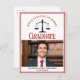 Cette carte postale classique d'annonce de remise des diplômes de la faculté de droit sur mesure en rouge et noir présente une typographie élégante pour un diplômé de la promotion 2024 au-dessus de votre photo d'étudiant. Personnalisez avec votre année de remise des diplômes sous les écailles de la justice et votre photographie pour des cartes postales personnalisées de juriste ou d'avocat de grande qualité.