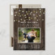Photo Rustic Grange Mariage en bois Save The Date Cards - présente une grange imprimée ou un arrière - plan en bois récupéré avec des étoiles d'or et des lampes à cordes brillantes au sommet. Vous pouvez changer la photo du couple de démo en l'une des vôtres.