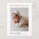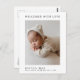Ce design moderne et simple présente un minimaliste arrière - plan blanc et calligraphie noire. L'en-tête "Bienvenue avec amour" et d'autres textes personnalisés : message, nom du bébé, statistiques, sont en typographie classique et élégante. Il y a une seule photo au centre. Le verso contient un message de remerciement personnalisé. Créez votre propre carte de remerciements de baby shower / nouveau faire-part de naissance bébé en cliquant sur le bouton "Personnaliser" et en remplaçant les modèles par vos détails et votre photo.