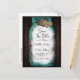 Carton d'invitation de mariage sarcelle rustique représentant un pot en verre avec des guirlandes lumineuses et des cœurs en toile de jute sur fond de bois de grange. Personnalisez facilement cette carte en ligne. Articles assortis disponibles.