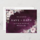 Peinture aquarelle botanique florale et verdure dans un rose poudré rustique, bordeaux et gris sur fond aquarelle prune violet sombre, moderne et élégant, beaux cartons d'enregistrement de date pour mariage moderne, mariage rustique, mariage boho et mariage de jardin en automne.