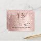 Une carte de "Save the Date" girly et tendance pour une fête de Quinceañera, fête des 15 ans. Fond métallisé de couleur or rose décoré de gouttes et de poussière de paillettes de couleur or rose et argenté. Personnalisez et ajoutez une date et un nom/texte. Le texte : "Save the Date" est écrit avec un grand style de lettrage manuscrit tendance avec des fioritures. Le numéro 15 est dans une police de caractères de style ballon.