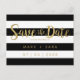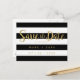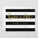 Cartes postales d'invitation de mariage moderne avec date de sauvegarde avec fond rayé noir et blanc et police à effet de feuille d'or.