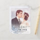 Modèles de cartes postales photo pour annonce de report de mariage modernes - Feuilles aquarelles bleues vintage et écriture manuscrite sur fond d'éclaboussures aquarelles.