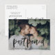 Besoin de changer la date de votre mariage ? Nos élégantes cartes de report de mariage sont parfaites pour informer vos invités de votre nouvelle date de mariage. La carte de report de date tendance présente "reporté" dans un script brossé à la main en noir avec votre photo de fiançailles horizontale. Personnalisez la carte en ajoutant vos noms, adresse de retour, détails du mariage, site web du mariage, etc.
