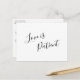 Carton d'annonce de report de mariage simple noir et blanc avec "L'amour est patient" dans un script manuscrit élégant sur le devant. Le verso contient votre message personnel et votre adresse de retour pour un envoi facile. Le lettrage à la main chic ajoute une touche romantique à ce design minimaliste. Une carte postale d'annonce moderne qui est parfaite pour informer vos invités que votre mariage a été reporté.