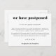 Si les circonstances exigent malheureusement de reporter votre mariage, une carte postale vous permettra de le faire savoir le plus tôt possible. Ce design minimaliste typographique en noir et blanc est entièrement personnalisable. Personnalisez facilement le texte des deux côtés. Vous pouvez également modifier les styles et les couleurs des polices et des couleurs arrière - plans si vous le souhaitez via l'option customiser plus loin. Si vous avez besoin d'aide, s'il vous plaît envoyez-moi un message.