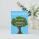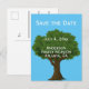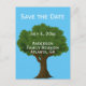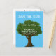 « Gardez la date » est en haut de cette carte postale bleue. Un grand arbre sert de fond à votre texte personnalisé tel que le nom de famille, la date de la réunion de famille et le lieu.