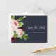 Elégante aquarelle florale enregistrer la date carte postale fonctionnalité "enregistrer la date" en calligraphie chic avec vos noms et date mariage en dessous, accentué par un bouquet luxuriant de fleurs aquarelles en marsala bordeaux et rose roux avec feuilles et feuillage vert vif. Le lettrage blanc sur un riche arrière - plan bleu marine de minuit donne un charme spectaculaire et élégant. Les cartes postales sont inversées pour afficher d'autres détails sur la date, y compris votre site Web mariage, avec votre adresse de retour et l'espace pour l'adresse du destinataire.