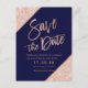 typographie Rose Gold sur bloc de couleur personnalisable bleu marine rose gold pailleté, et rayures géométriques en faux rose gold chic save the date mariage , parfait pour un mariage élégant et stylé,