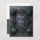 Ce mariage personnalisé à thème gothique sauvez la date faire-part carte postale avec des roses bleus turquoises sur un cadre gris foncé pour vos infos de faire-part mariage. Le verso de la carte postale contient plus de détails mariages que vous pouvez customiser. Félicitations à votre fiançailles ! Conçu par Susan Coffey. Image générée avec AI.