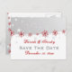 Carte postale de mariage flocon de neige rouge argent gris blanc Enregistrez la date, avec une bande ondulée en gris argenté avec des étoiles et des flocons de neige élégants rouges. Texte en gris et rouge. Un design élégant parfait pour votre mariage d'hiver, de décembre ou de Noël. Moderne et contemporain, mais également adapté à un mariage traditionnel. Ce design élégant et classe peut être utilisé pour d'autres occasions spéciales telles que des fiançailles ou des anniversaires.