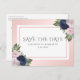 Complétez votre célébration de mariage bleu marine et rose blush avec ces élégantes cartes "save the date" de mariage bleu marine et rose blush avec des fleurs roses et bleues encadrant les détails du mariage. Articles assortis disponibles.