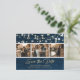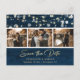 Photo marine personnalisée bleu et or mariage enregistrer les cartes postales de date avec une police de script élégante. Notre mariage sauf la date présente un montage photo de 3 images contre un arrière - plan rustique en bois bleu marine orné de lampes à cordes. Personnalisez facilement cette photo rustique enregistrez la carte postale de la date avec vos images et les détails du mariage, y compris un site Web mariage, si vous le souhaitez. Pour des demandes personnalisées, envoyez-nous un message.