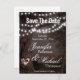 Une carte romantique de sauvegarde de la date avec une guirlande de lumières et un cœur avec des initiales dans un arbre.