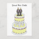 Deux mariés dessin animé en tenue assortie debout sur le dessus d'un gâteau multi-étages, citron et blanc. L'image a un fond blanc croquant et est accompagnée des mots 'Sauver la date'.