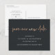Besoin de changer la date de votre mariage ? Informez vos invités avec cette carte postale moderne et légère qui présente "sauver notre nouvelle date" en lettrage manuscrit en faux cuivre sur un fond noir riche et doux. Personnalisez avec vos noms et la nouvelle date de mariage en dessous en lettrage blanc.