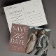 Une carte postale moderne enregistrer la date conçue pour accueillir votre photo fiançailles préférée verticale ou portrait. "Enregistrer la date" apparaît à côté de votre photo dans un bloc blanc cassé et des lettres de script, avec vos noms, la date mariage et l'emplacement du mariage sous. Les cartes postales sont inversées pour afficher d'autres détails sur la date, y compris votre site Web mariage, avec votre adresse de retour et l'espace pour l'adresse du destinataire.