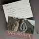 Une carte postale moderne enregistrer la date conçue pour accueillir votre photo fiançailles horizontale ou paysagère préférée. "Enregistrer la date" apparaît sous votre photo en bloc blanc et en écriture de script, avec vos noms, date mariage et emplacement du mariage sous. Les cartes postales sont inversées pour afficher d'autres détails sur la date, y compris votre site Web mariage, avec votre adresse de retour et l'espace pour l'adresse du destinataire.