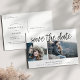 Une carte postale moderne enregistrer la date conçue pour accueillir deux de vos photos fiançailles préférées. "Enregistrer la date" apparaît au-dessus de vos photos en écriture manuscrite en noir, avec vos noms, la date du mariage et l'emplacement du mariage sous Cartes postales inversées pour afficher les détails supplémentaires de la date, y compris votre site Web mariage, avec votre adresse de retour et l'espace pour l'adressage du destinataire.
