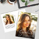 Cette carte de vœux de fin d'études élégante présente sa photo préférée sur laquelle est superposée la mention "Diplômé" dans un texte blanc élégant ainsi que son nom, son école et son année de promotion dans une typographie blanche moderne. Au verso, ajoutez une photographie supplémentaire et un message personnalisé.