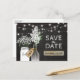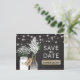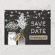 GABARIT DE SAUVEGARDE DE DATE DE LUMIÈRES DE JARRE DE MASON | Un fond de tableau noir rustique, des lumières scintillantes en fil, un pot Mason et une bouteille avec une étiquette-cadeau nouée autour avec les initiales du couple, des fleurs blanches douces, un morceau de bois campagnard et une phrase élégante de sauvegarde de date. Trouvez d'autres cartes postales de sauvegarde de date de campagne sur http://www.zazzle.com/special_stationery